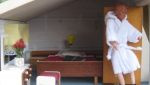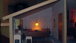 Der Holzrahmen des Hauses ist weiß gestrichen